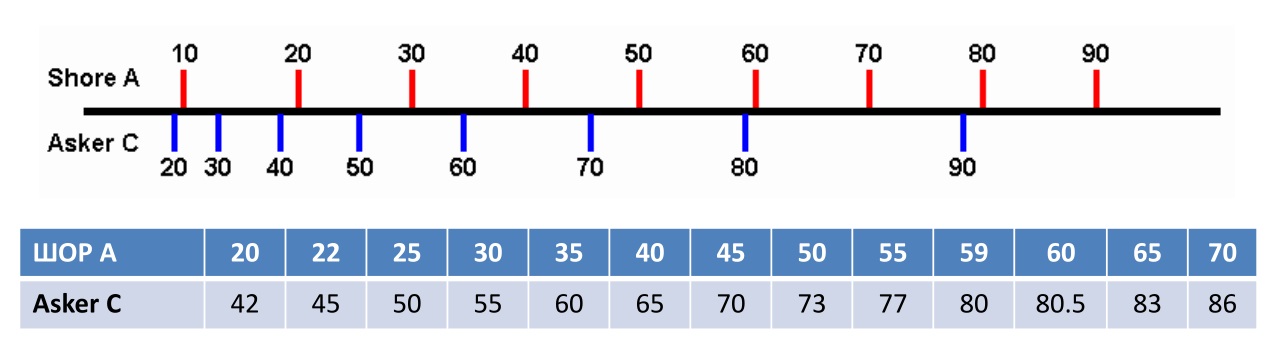 Приблизительное соотношение между шкалами дюрометров Шор А и Аскер С